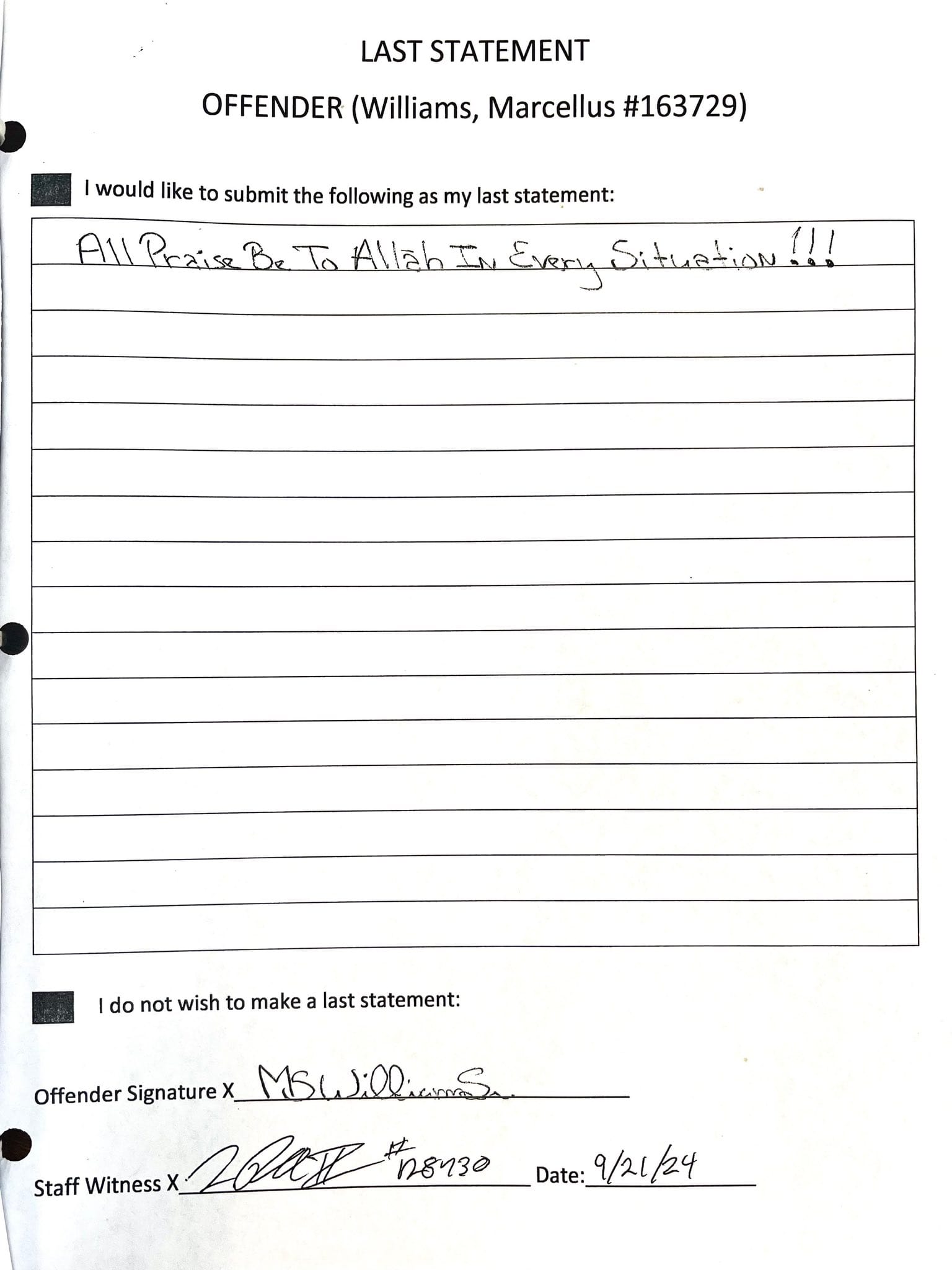 And yet he was killed last night. Despite the botching of evidence, despite waves of protest and advocacy, despite every avenue of the legal system being pursued so that Marcellus Khaliifah Williams could live, he is no longer with us today.