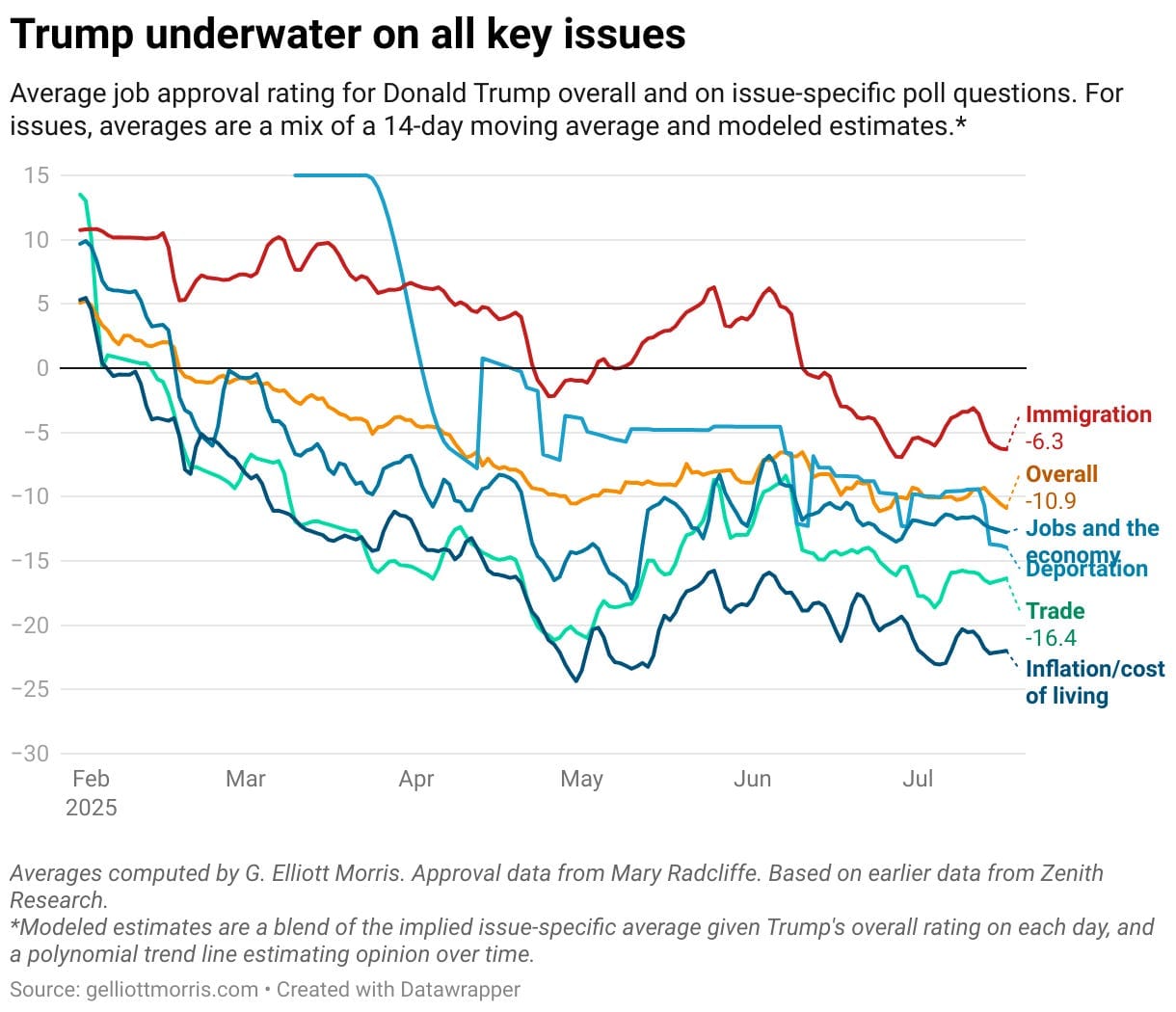 It’s worked in the past, but the bill is coming due. Trump’s approval is tanking. In areas where people once had faith in him, from the economy to inflation to immigration he’s now underwater: