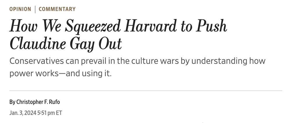Maybe the clearest sign, the clearest admission that all of this was part of the conservative push to attack education and build the muscles and power to limit academic institutions came from one of the architects of the plan himself. Chris Rufo is already known for working with Ron DeSantis to attack the New College in Florida, driving away numerous LBGT students, and making the school a far more conservative and repressive institution. On December 19th Rufo publicly tweeted out, “We launched the Claudine Gay plagiarism story from the Right. The next step is to smuggle it into the media apparatus of the Left, legitimizing the narrative to center-left actors who have the power to topple her. Then squeeze.” And his plan worked. He is now openly bragging about it not just on social media, but in the Wall Street Journal.