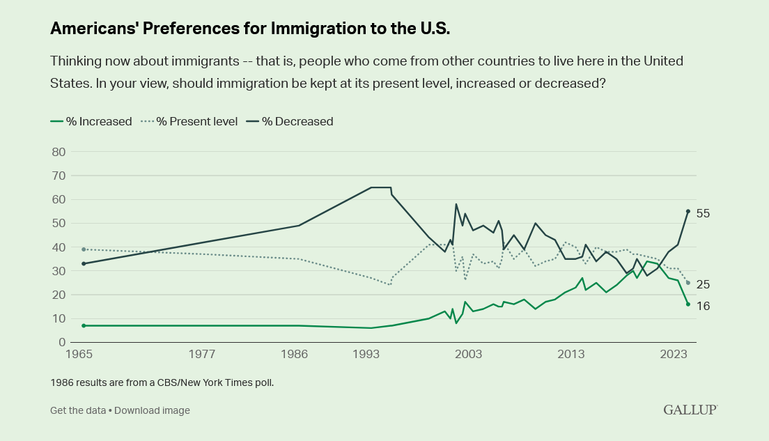 I wish this nasty work didn’t need to be studied, but it does. The shift in public opinion, particularly over the last four years, is enough to give you whiplash. In 2020 just 28% of Americans thought that the number of migrants arriving in this country should go down. A short four years later that number stands at 55% today, according to Gallup.