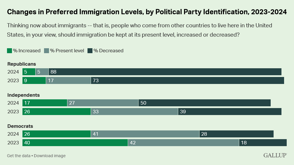 Democratic voters have jumped 10% since just last year when it comes to thinking the number of immigrants needs to decrease. Just one year ago Democrats were 40-18, with far more thinking migration numbers should increase than decrease. Now those numbers have shifted to 26-28 in the Gallup polling.
