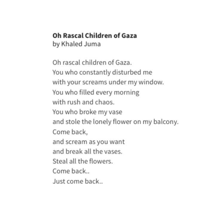 I will leave you with this poem from Khaled Juma, painful and inescapable and necessary: