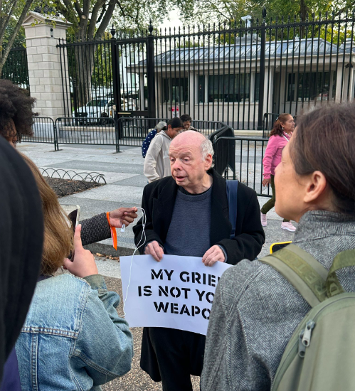 Palestinians are forced to make their grief political again and again. To stop the genocide of their people they do TV interviews through tears while being asked if they support Hamas. To stop the genocide of their people painfully intimate moments of dead children in the arms of mourning parents are shown on TV. To stop the genocide of their people little orphans are shown in hospitals with nowhere to turn. So the very least that the Jewish people can do is go to the White House and say “my grief is not your weapon.” My grief will not be turned into a bomb, sent with my money to cause more death. I reject my grief being used as fodder for genocide, which will kill more Palestinians, and more Israelis, because to turn our grief into yet another death will never bring peace. What will bring peace is an end to the occupation and an end to apartheid.