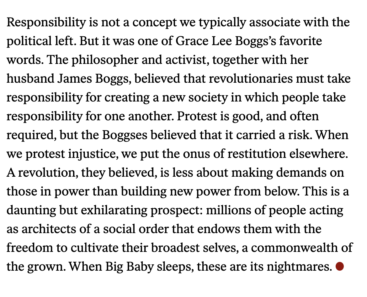 In lieu of responsibility, Tarnoff writes about this pursuit of an impossibly carefree life that pervades much of the country. And I would argue that our most dangerous adversaries, from Musk to Vance to Thiel, display a childish hunger for power as well. This hunger is childish in that there remains no conception of the other. Our lives do not matter to these people — in the adolescent sense of superiority that pervades the tech robber baron class we are lesser beings, therefore undeserving of say in the world they childishly believe they created.