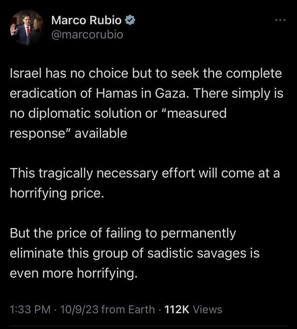 I know that no one reading this stands with Marco Rubio. But I urge you, I implore you to consider how the rhetoric of Israel’s own defense minister is genocidal in itself. To call millions of people human animals is following a long history of language used to justify or excuse slaughter. We as Jewish people in particular are aware, should be highly aware and sensitive to that. We should rebuke it fully and completely. And even more important are the actions being taken. A full and total siege by air, land, and sea that does not let in food, water, or medicine. Israel bombing the southern exit from Gaza into Egypt, which serves to trap the people of Gaza even more completely. Bombing residential towers all night, crushing entire neighborhoods in an extremely densely populated area. These actions are intertwined with the rhetoric of dehumanization, and they speak far louder.