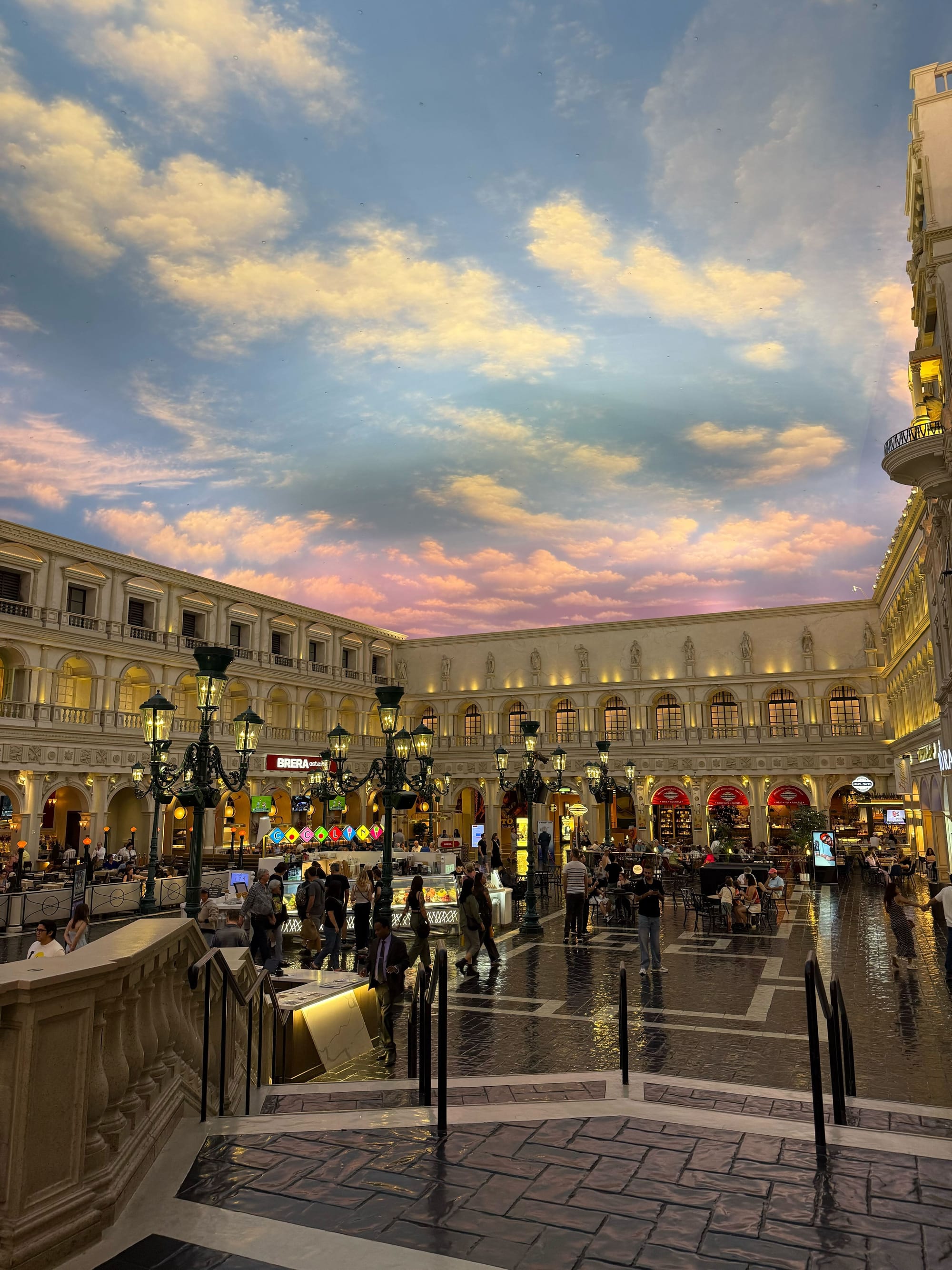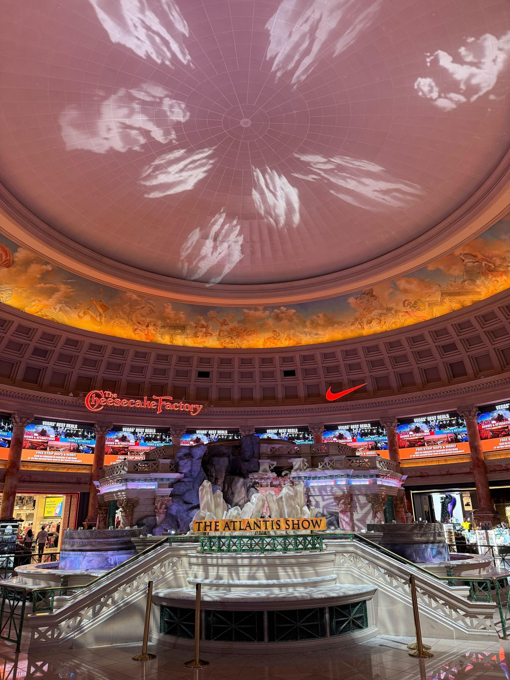 I also hadn’t been prepared for the indoor smoking, for the cost of everything on the Strip, or for the fake skies. Several establishments, like Caesar’s Palace and The Venetian, are not just casinos and hotels, but also gigantic malls. Filled with international brands, and gimmicks like shoddy recreations of the canals of Venice or the plazas of Rome, these buildings seem to go on and on, endless halls of consumption. And, either in an attempt to be distinctive or to make you content with being inside these characterless behemoths for countless hours, the ceilings have fake skies.