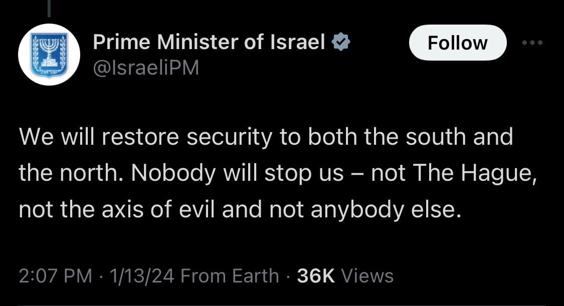 So what does Netanyahu, who Biden and UK Prime Minister Rishi Sunak remain staunchly allied to, have to say? As the U.S. and Britain bomb Yemen, and as Israel is taken before the International Court of Justice by South Africa, the Prime Minister released an official statement on Twitter yesterday. You can read the whole thing for yourself, if you can stomach it, but here is the part that jumped out to me, and to much of the world: