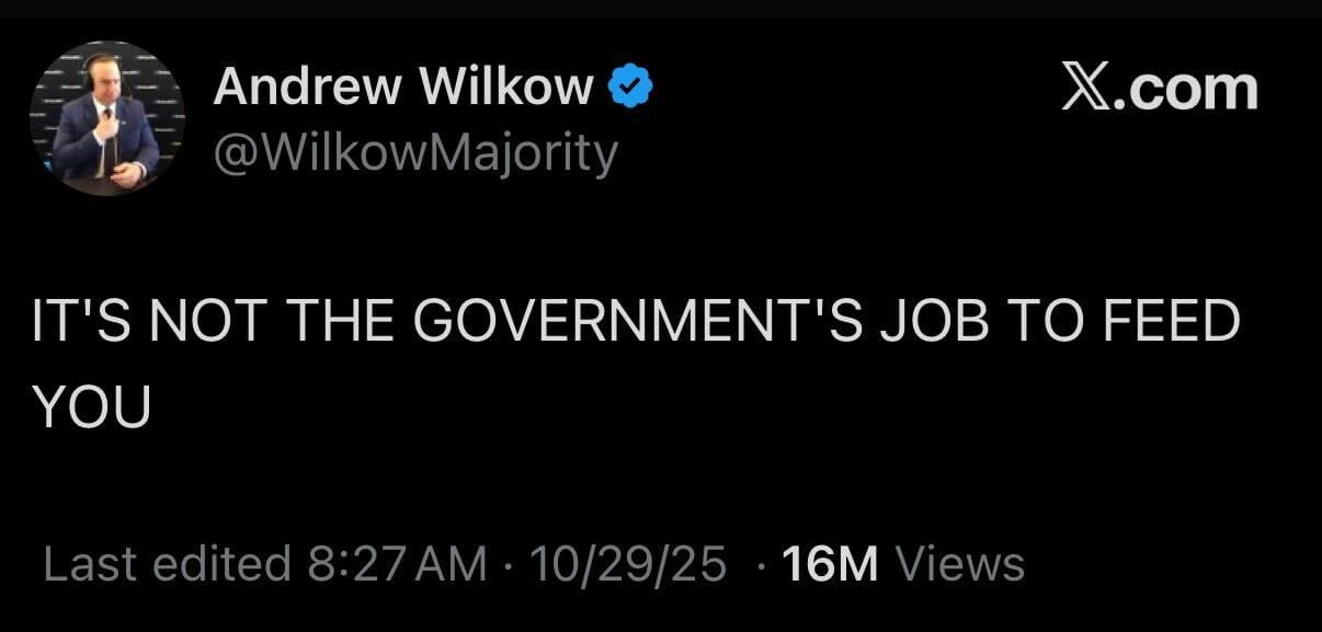 This needless pain didn’t come out of nowhere. The right has long preached that it’s good to cut off assistance to anyone and everyone, and now we see fascists celebrating and justifying the SNAP cutoff. Some people peddle lies about fraud, others say it’s terrible that food stamps can pay for “unnecessary” items like cookies or Dijon mustard or lobster, and some just put their entire beliefs system out there, crying that the government shouldn’t be feeding anyone anyway.