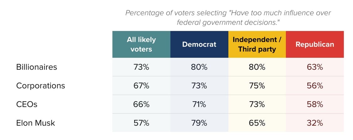 Some people might be feeling some vindication, some catharsis seeing the fascist, billionaire onslaught against government workers and basic services. Some on the right might think this is finally the political approach they’ve been hoping for, the one their anger excitedly awaited. But they are the minority. New polling from this past week shows that most people aren’t thrilled with what they’re seeing in Washington. Right now 73% of voters think billionaires have too much influence over federal government decisions. A majority feel the same way about CEOs, corporations, and Elon Musk specifically.